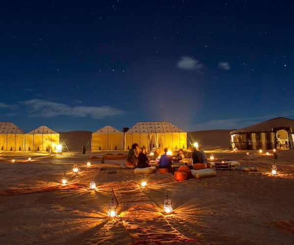 As night falls, you’ll reach your Berber desert camp, where traditional hospitality awaits. Enjoy a delicious Moroccan dinner by the campfire, accompanied by Berber drumming and stories under the starry night sky. The silence of the desert, broken only by music and laughter, makes for an unforgettable evening. Sleeping in a traditional nomadic-style tent beneath the brilliant Milky Way is an experience few will forget.