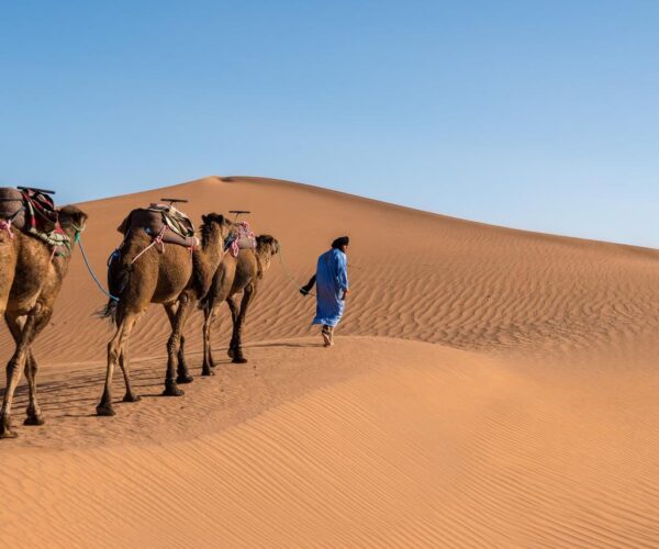 Your 2-day trip from Marrakech to Erg Lihoudi begins with an early morning departure from your accommodation. The route winds through the majestic Atlas Mountains, offering spectacular views of traditional Berber villages nestled along mountain slopes. As you travel toward Erg Lihoudi, you’ll witness Morocco’s diverse geography transform from snow-capped peaks to arid desert terrain.